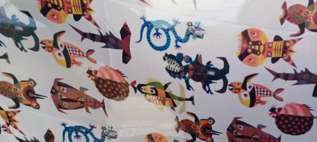 Cesar Manrique design art scarf textile in perfect condition. Depicting all the fish from the Atlantic Fauna Fish series or Fish Series, shark fish, sole fish, frog fish, flying fish, etc - stunning! Please see the other textile designs available on the website. Ready to be framed or used as a garment.